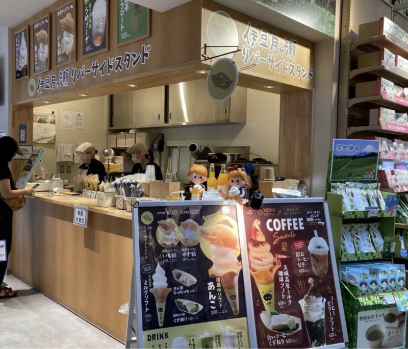 店内にある「伊豆月ケ瀬リバーサイドスタンド」には、天城の猪最中が乗ったソフトクリームや月ケ瀬梅園梅ソーダなどがありました。