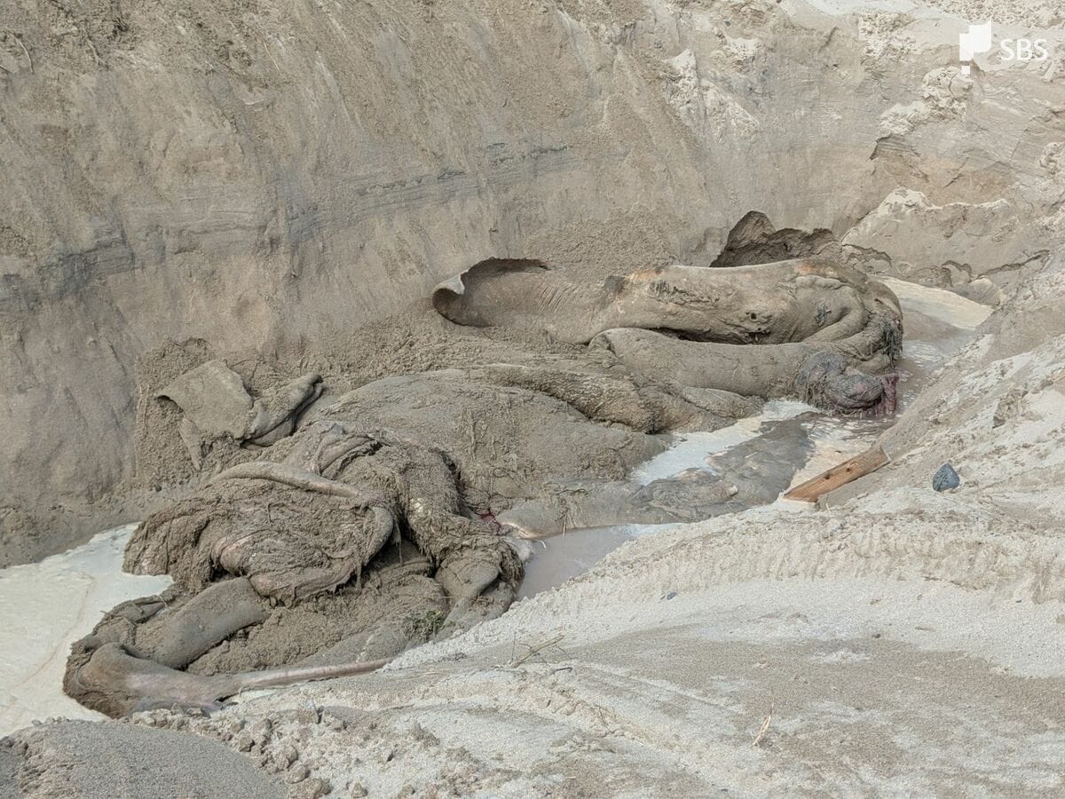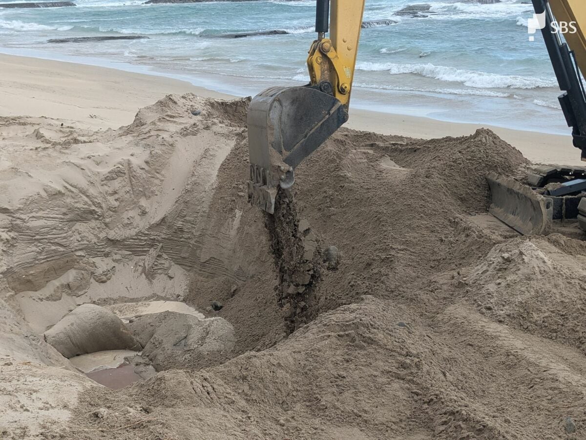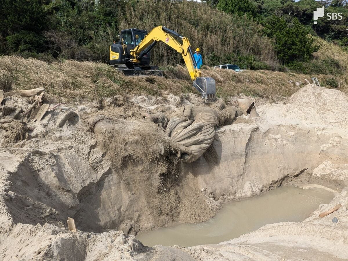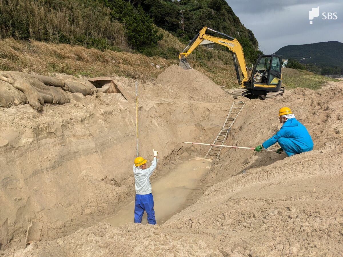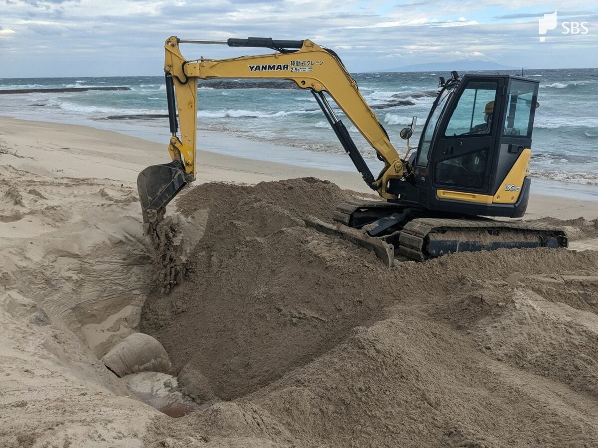 海岸に打ち上げられた体長9.4メートルのクジラの死骸 砂浜に穴掘り埋められる=静岡・下田市