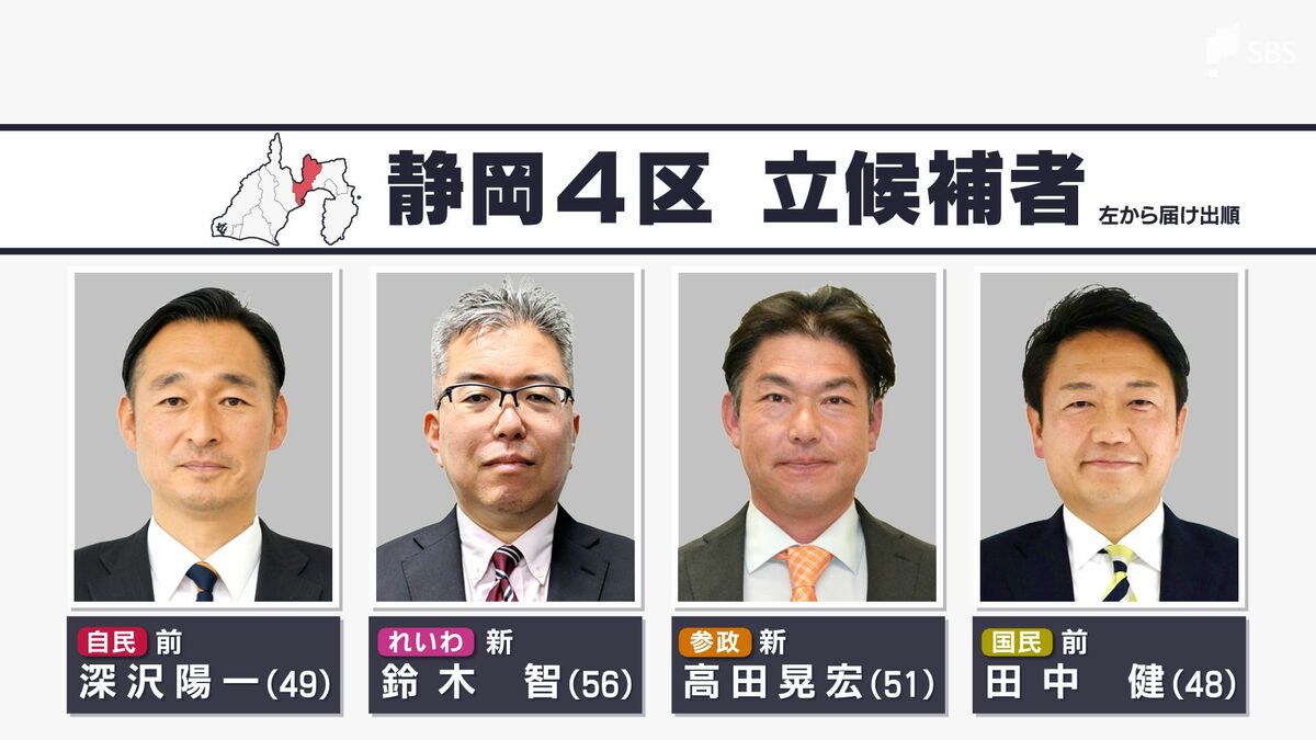 静岡4区に立候補しているのは、自民党の深沢陽一(ふかざわ・よういち)候補、れいわ新選組の鈴木智(すずき・さとる)候補、参政党の高田晃宏(たかだ・あきひろ)候補、国民民主党の田中健(たなか・けん)候補の4人です。