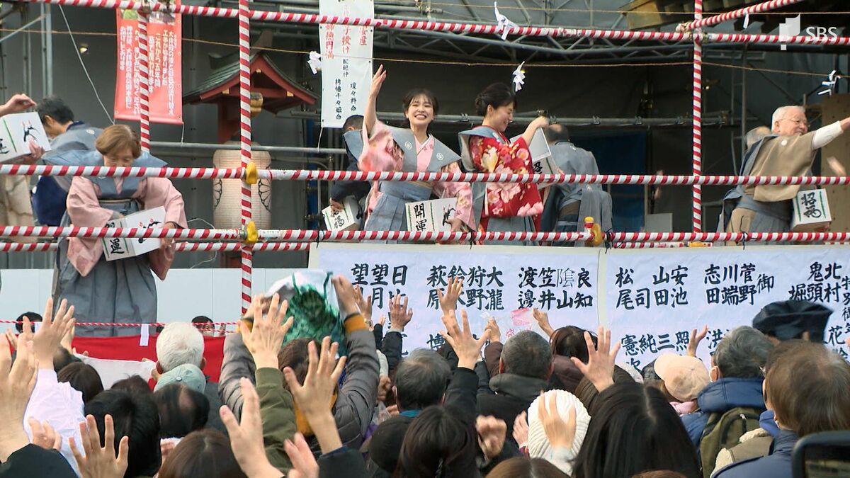 静岡浅間神社で開かれた節分祭では、SBSの堀葵衣アナウンサーやフリーアナウンサーの鬼頭里枝さんなど約50人が、大きな掛け声とともに豆や餅などをまきました。