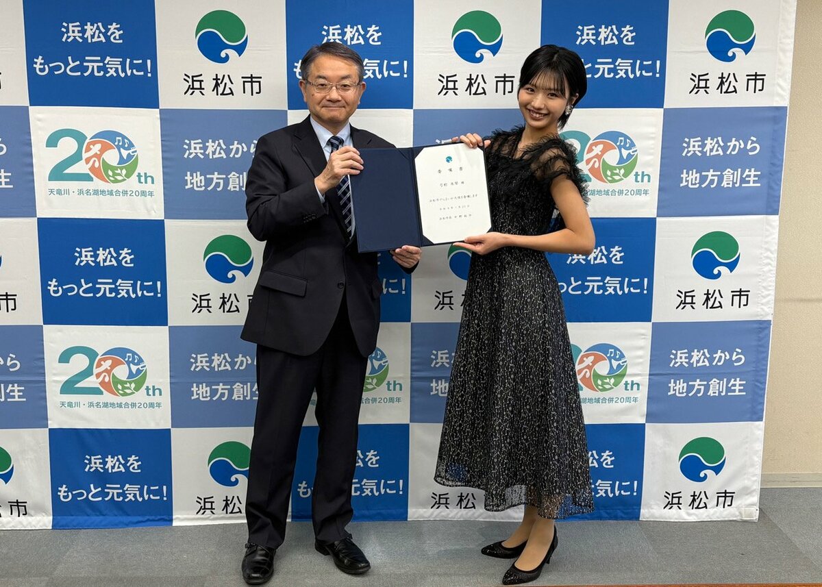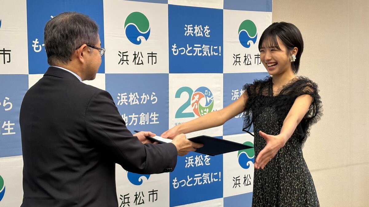 アイドルグループ「モーニング娘。'26」の弓桁朱琴さん(17)が2月3日、浜松市役所を訪れ、中野祐介市長から浜松市「やらまいか大使」の委嘱を受けました。