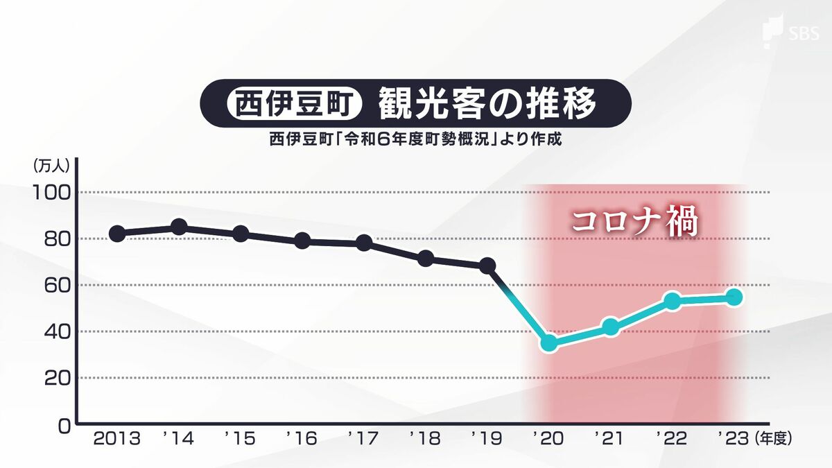 西伊豆町の観光客数の推移です。低迷していたコロナ禍から徐々に戻りつつありますが、回復しきってはいません。