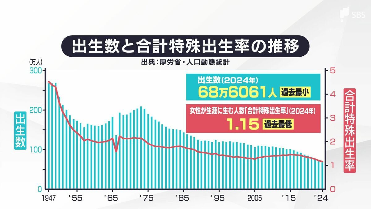厚生労働省の調査によりますと、国内の出生数は2024年に68万6061人と過去最少を記録しました。2.1前後で人口が「横ばい」になるとされる「合計特殊出生率」も、2024年は1.15まで低下しました。