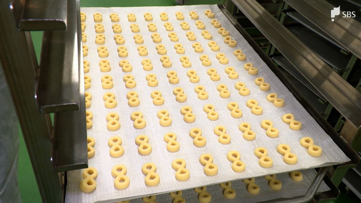 「工場の中はすでに甘い香りがしていますね。すごい!見てください。8という字がかたどられていますよ。思ったよりも小さいですね」