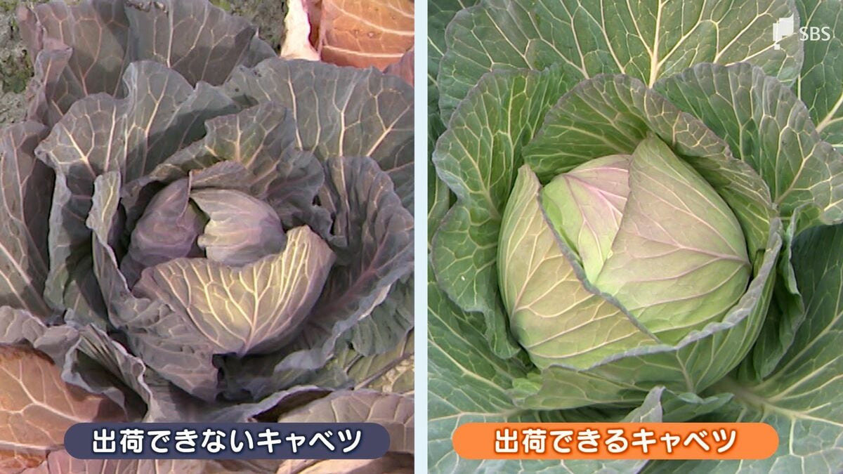 きれいに育ったキャベツと比べると、葉っぱは紫色でハリがなくその差は歴然です。この畑には6000玉のキャベツが植えられていますが、そのうち出荷できるのは100玉程度だといいます。