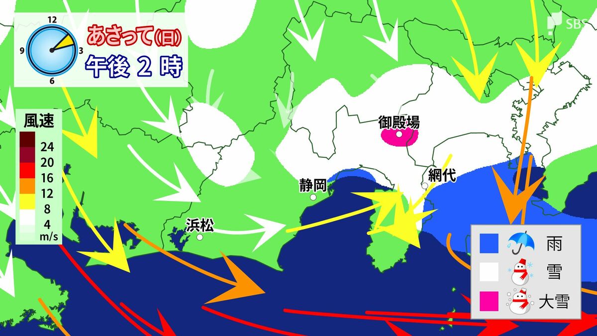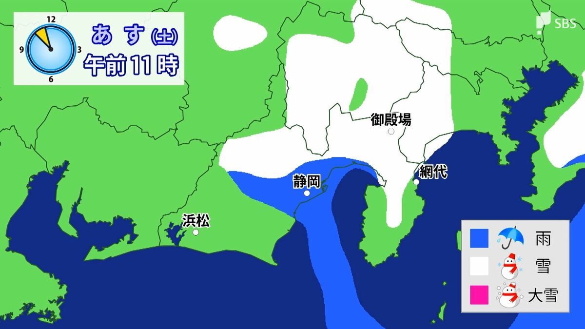 7日(土)に関しては静岡市では雨、東部を中心に広く雪となりそうです。午後6時までに、多いところでは東部・山地で3センチ、平地で2センチ、伊豆・山地で1センチの降雪が予想されています。東部・山地ではしつこく夜まで雪雲がかかりそうです。