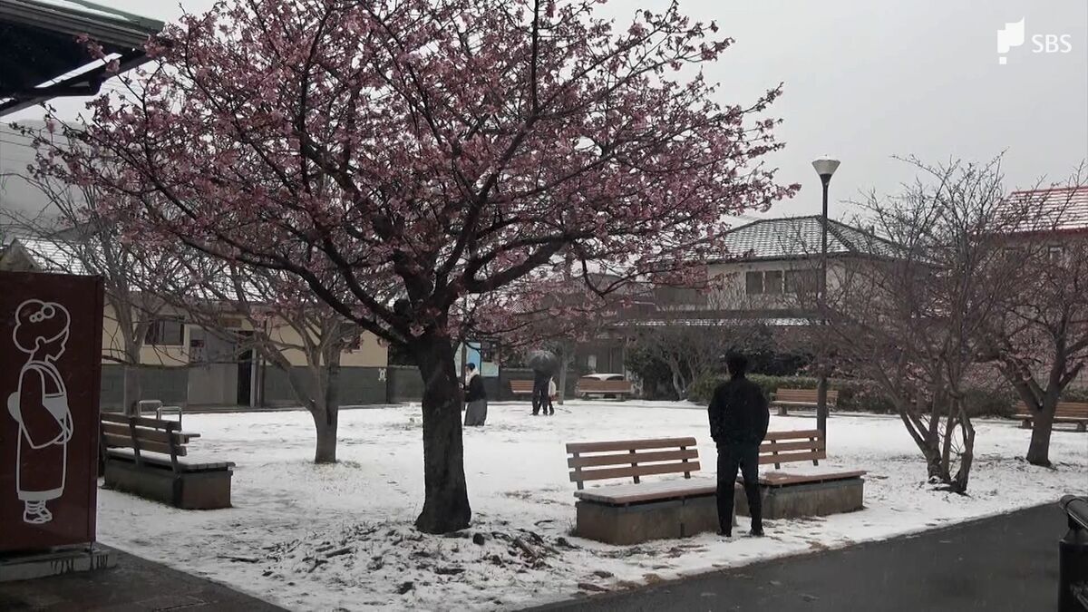 河津町で7日に開幕した河津桜まつりの会場でも雪が積もりました。この期間中に積もるほどの雪が降るのは珍しいということです。