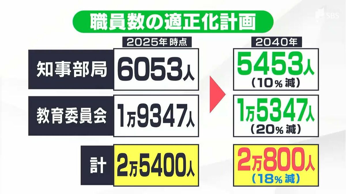現在、知事部局と教育委員会の職員数は計2万5400人。この職員数を昨今の人口減少を見据え、2040年までの15年間で2万800人に減らす計画です。