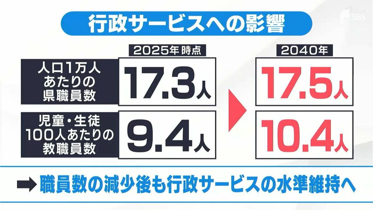 県は計画期間中の行政サービスの影響も試算していて、人口1万人あたりの県職員数は横ばいの17人程度に、児童生徒100人あたりの教職員数についても現状と同じの10人程度に維持できるとしています。