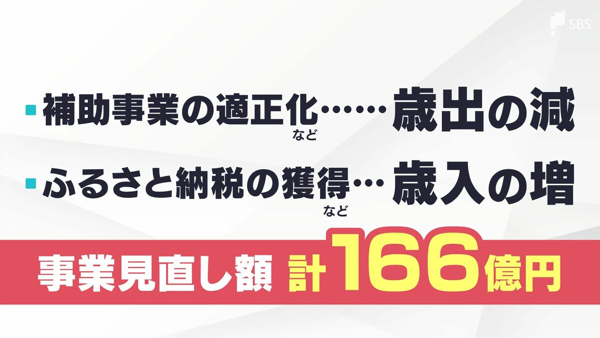 県の補助事業の適正化で歳出を減らし、ふるさと納税の獲得で歳入を増やして計166億円の事業見直しにつなげる方針です。