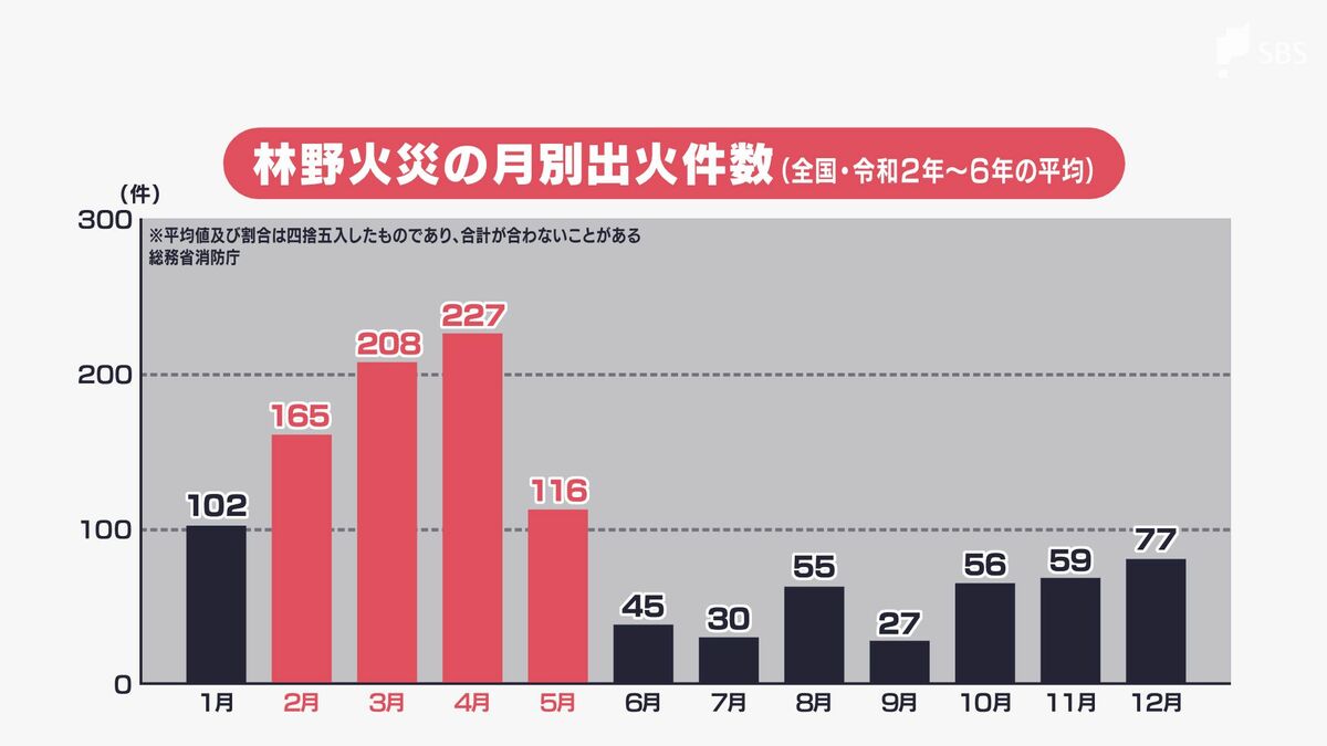 総務省消防庁のデータによると、乾燥した次期に危険度が高まる林野火災。