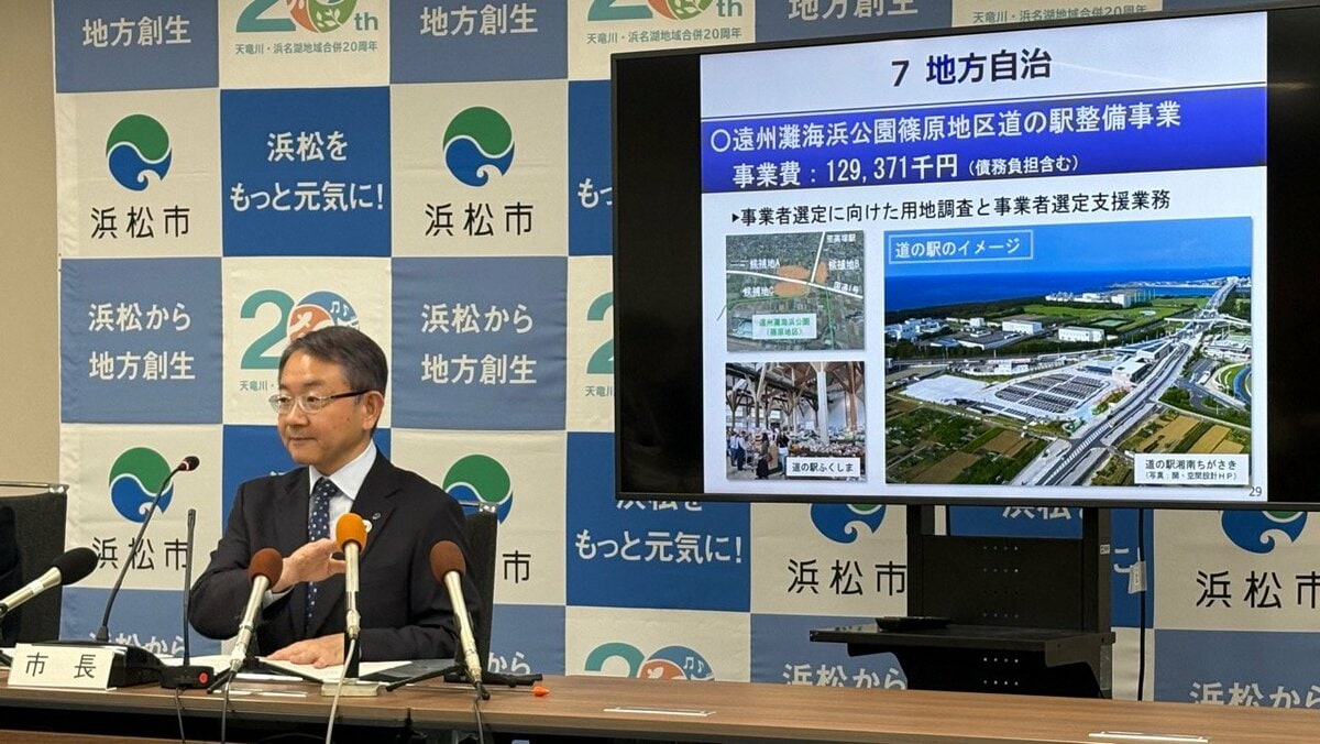 浜松市は2月12日、2026年度当初予算案を発表し、中央区篠原地区に「道の駅」と「新武道館」をそれぞれ整備するための費用を計上しました。同地区の遠州灘海浜公園は、市が静岡県に建設を要望している多目的ドーム型スタジアムの建設予定地で、浜松市の中野祐介市長は「事業推進の後押しをしていきたい」と期待を込めました。