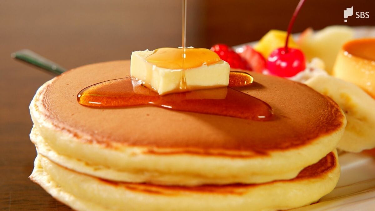 銅板の上で焼きあがったホットケーキ。香ばしい小麦の香りが食欲をそそります。
