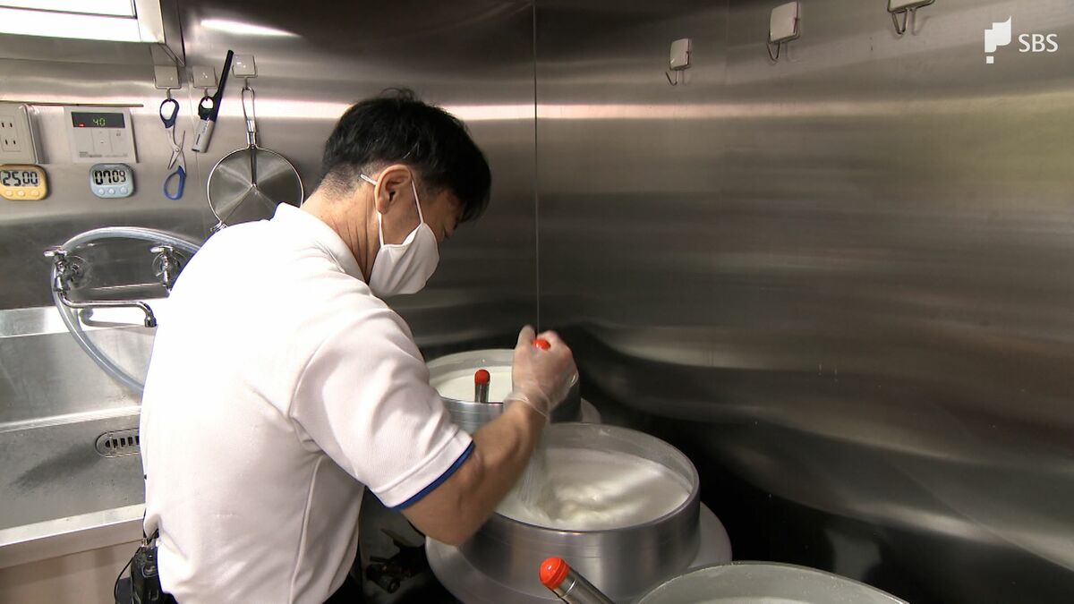 大きな釜に入っているのは、専用の装置で処理した超軟水と低脂肪の牛乳。