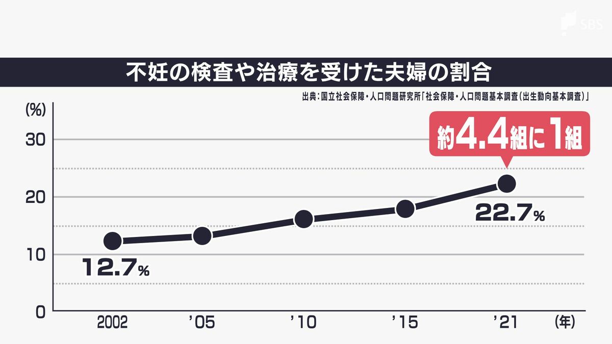 若い世代の痩せ体型や肥満の増加、出産年齢の高齢化などにより、不妊の検査や治療を受けた夫婦は22.7%で、約4.4組に1組で年々、増加しています。