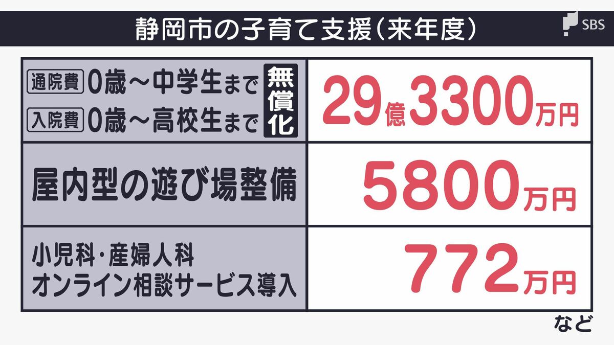 子育て支援ではこのほか、0歳から中学生までの通院費の無償化などに29億3300万円、屋内型の遊び場の整備に5800万円、小児科・産婦人科のオンライン相談サービスの導入に772万円が盛り込まれています。