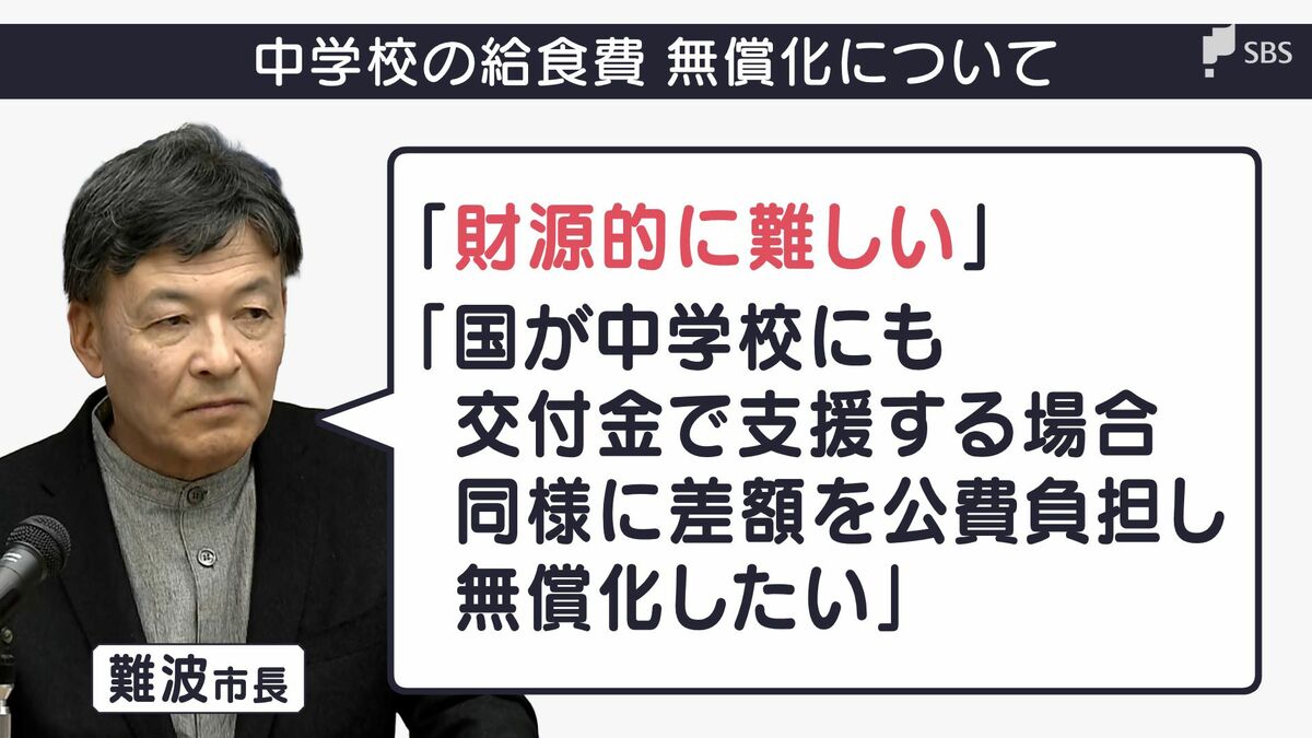 難波市長は中学校の給食費無償化に踏み切らなかった理由を「財源的に難しい」と話しました。