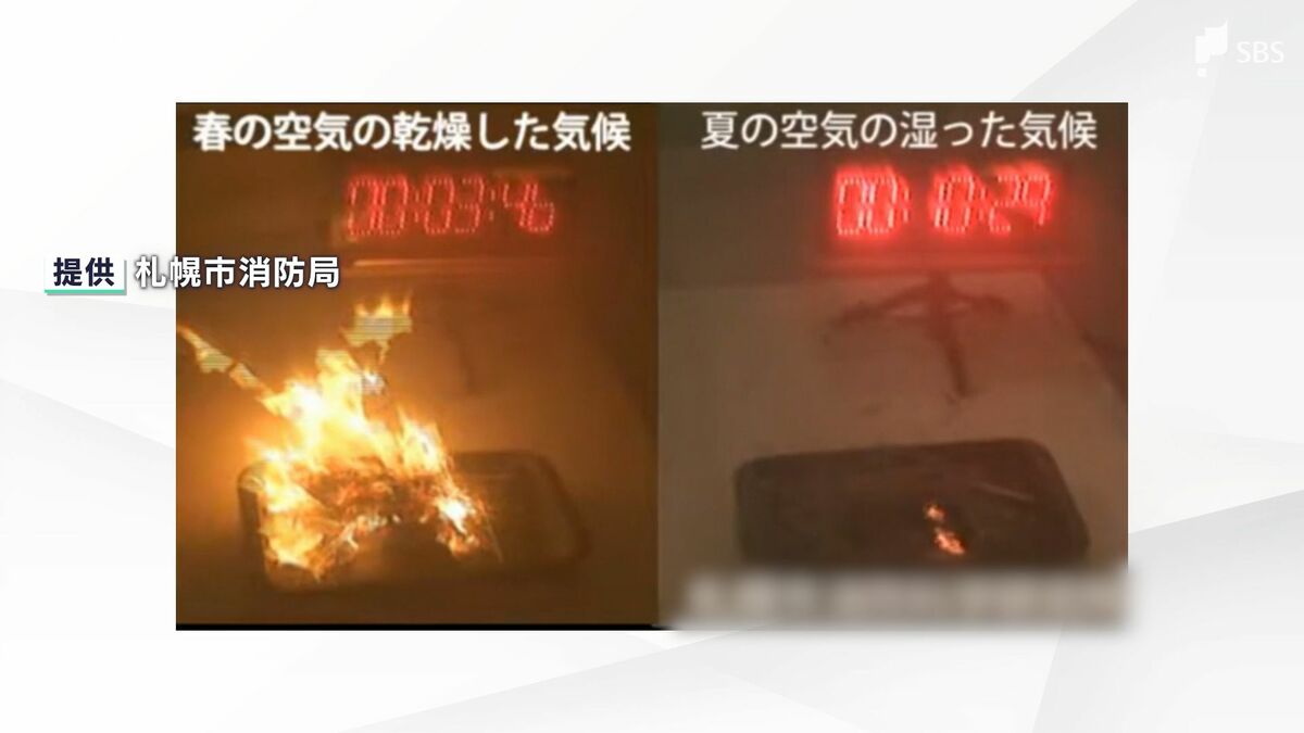 もう一方の実験では、湿度30%、風速3、4メートルの春先の空気と、湿度80%、風速1、2メートルの夏の空気を再現し、それぞれ枯草の上にたばこの吸い殻を置きました。