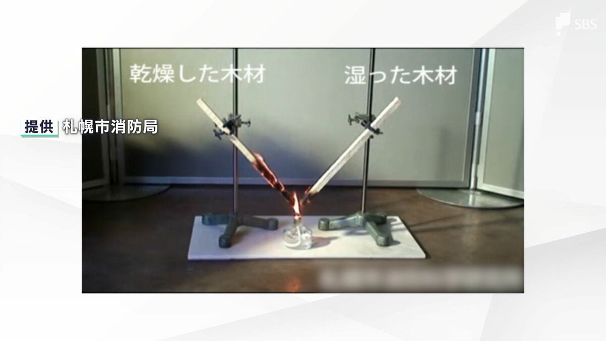 これは乾燥した木材と湿った木材で火の燃え方を比較した実験。それぞれ湿度30%と湿度80%の状態で1日置いた木材で、同時に火をつけたものの乾燥した木材のほうは急速に火が燃え広がりました。