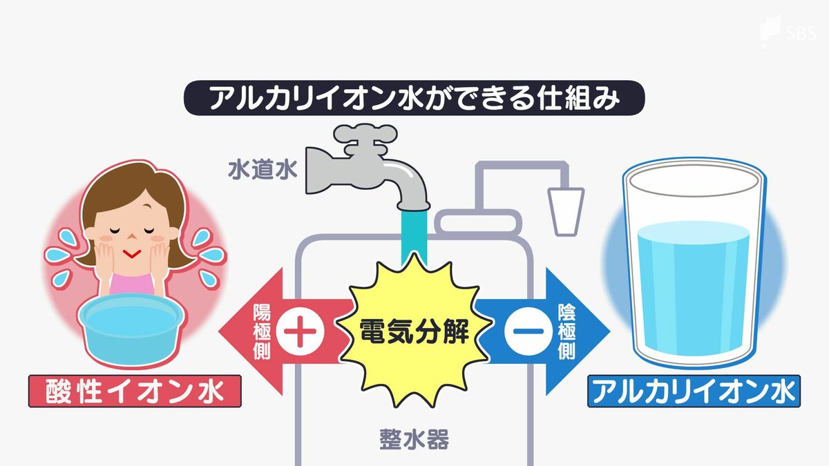 アルカリイオン水は、水を電気分解し、酸性とアルカリ性に分離する過程で生成されるもので、油を分解したり、汚れを分離させる界面活性効果があります。