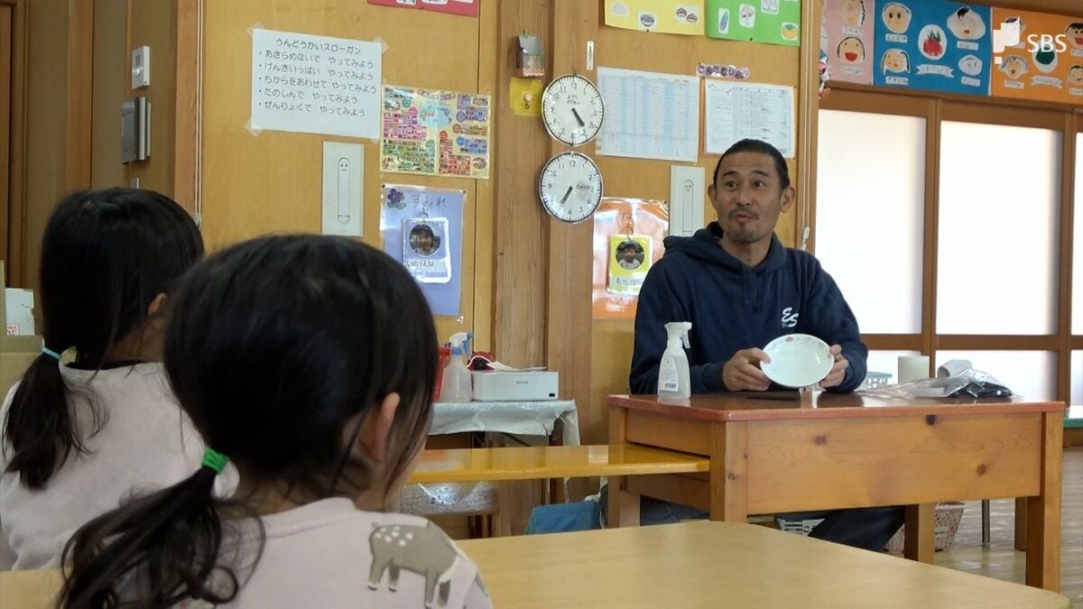 南伊豆町に住むネイチャーガイドの堀直也さんは、海洋汚染を防ぐために、7年ほど前から南伊豆町内の幼稚園や小学校を回り、食後の皿をふき取ることの大切さを教えています。