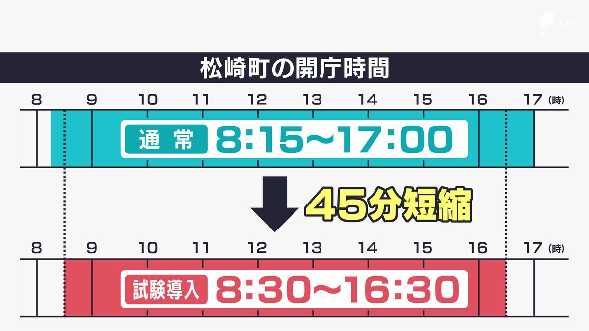 松崎町役場の開庁時間は、これまで「午前8時15分から午後5時」でしたが、2日から「午前8時半から午後4時半」に短縮されました。トータルで45分間短くなります。