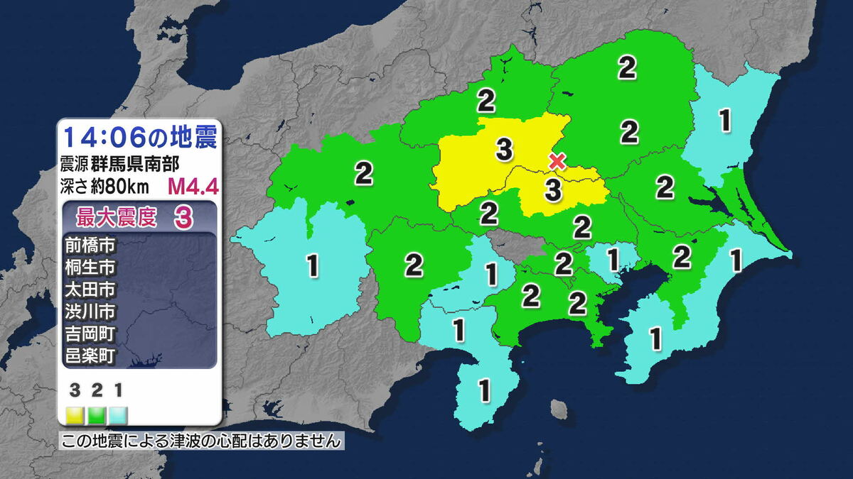 気象庁によりますと、震源地は群馬県南部で、震源の深さは約80km、地震の規模を示すマグニチュードは4.4と推定されます。