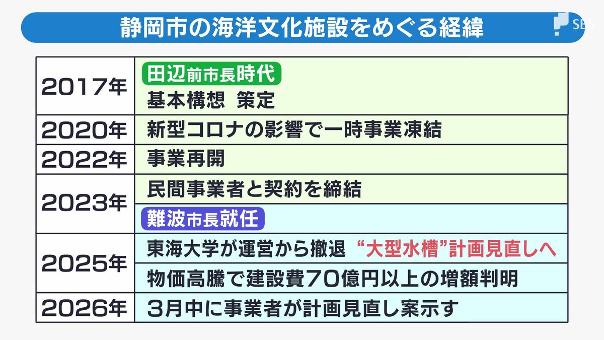 生物の飼育を担当する予定だった東海大学が、事業者との協議が難航したことで運営から撤退。目玉としていた大型水槽の計画に見直しが生じました。