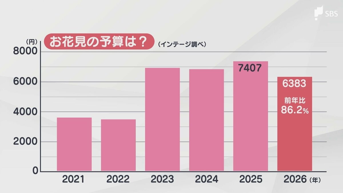 アンケート調査によりますと、2026年のお花見の予算は全国平均で6383円。2025年より約14%の減少となりました。